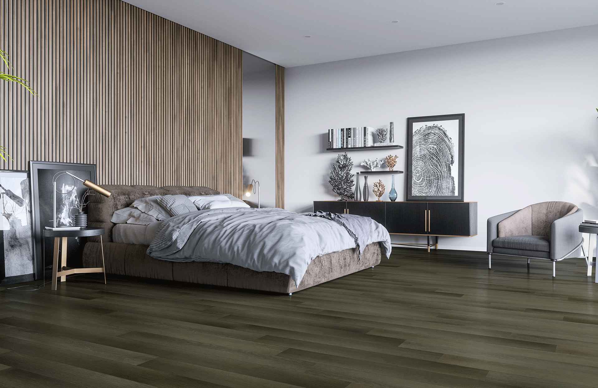 Конечно, кварцевый ламинат 32/41 класса такого темного цвета подойдет для средних и больших комнат, потому что такие насыщенные темные краски «крадут» у пространства место — зато дарят комнате особую атмосферу уюта и интимности.